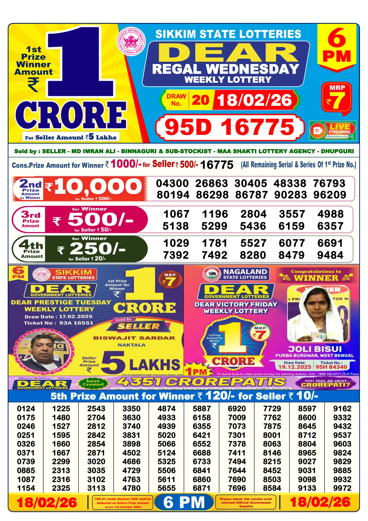 The much-anticipated 'Nagaland State Lottery - Dear Regal Wednesday' draw for 18th February 2026 has concluded, bringing immense joy and a life-changing fortune to its winners. The draw, keenly followed across the region, certainly lived up to its promise of excitement. The coveted 1st Prize, a truly remarkable sum, has been secured by ticket number 95D 16775. This unique combination from the '95D' series proved to be the golden ticket, a truly memorable win for one fortunate participant. The sequence 1-6-7-7-5 is a distinctive blend, with the repeating '7' adding a unique touch to this winning number.
